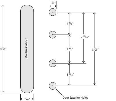 Dimensions for Anderson mortise lock cutout. The extra round holes allow for the mortise lock lock to be flipped over as a way to accomodate left or right hand doors.